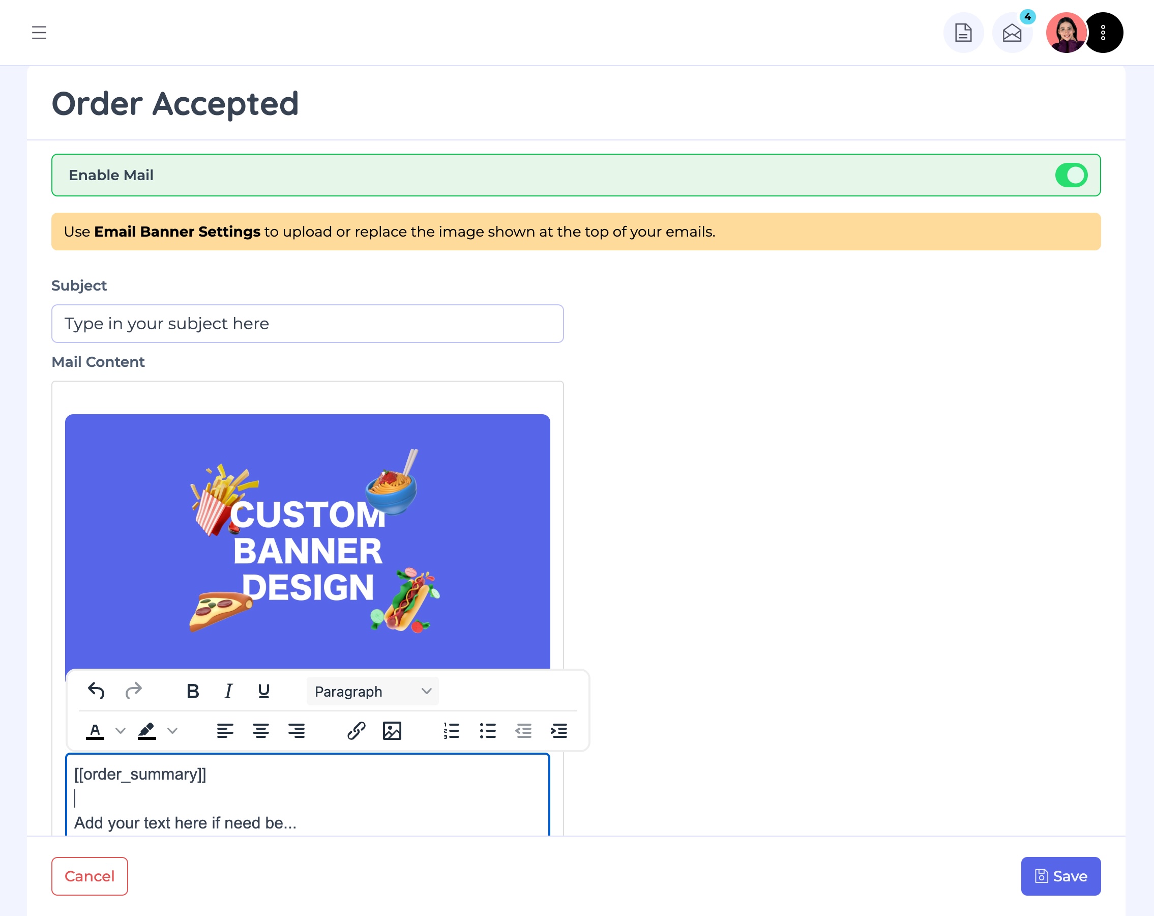 When editing the Order Accepted email, you can insert custom text and images within the body of the email, just after the [[order_summary]] tag. For all other emails, you can freely edit the content as normal.