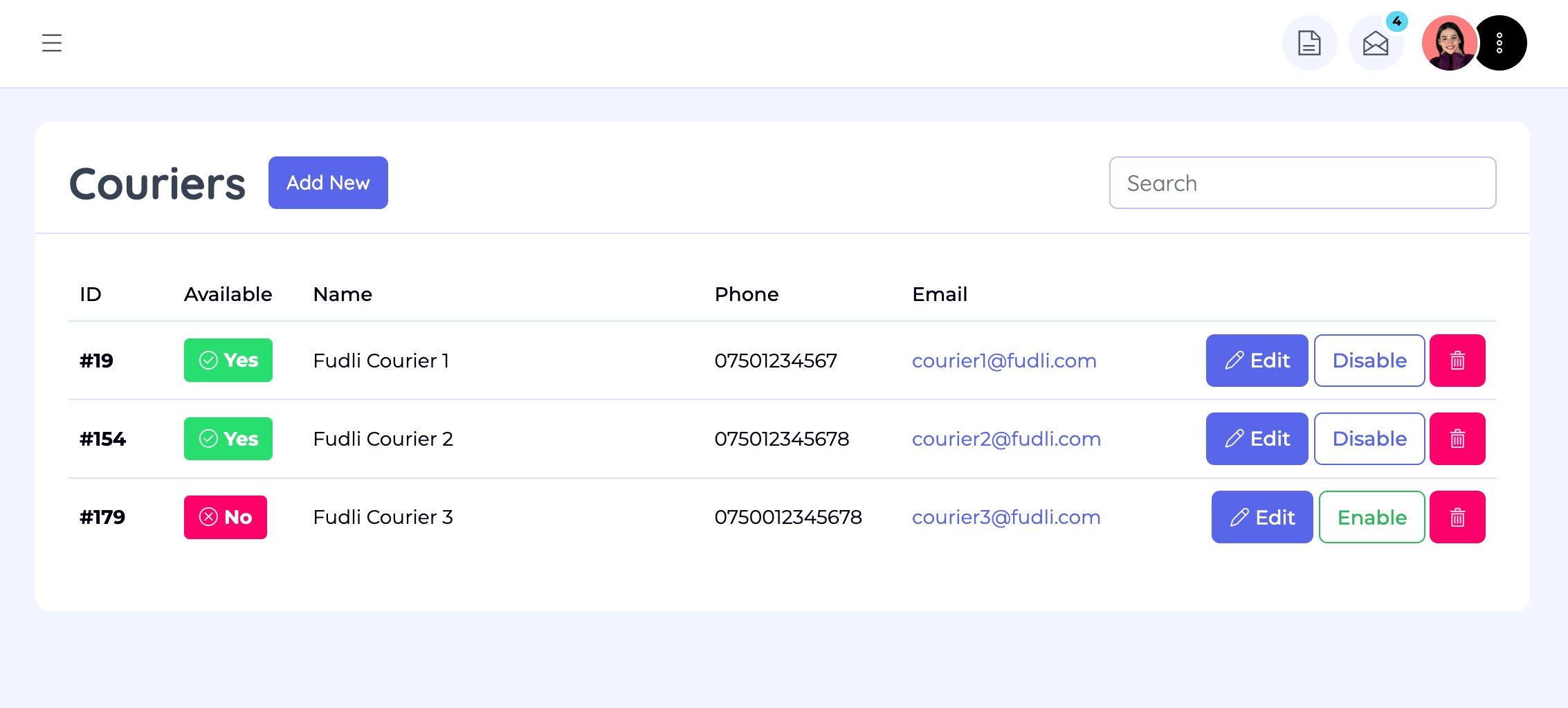 Couriers can be set as Available or Unavailable: