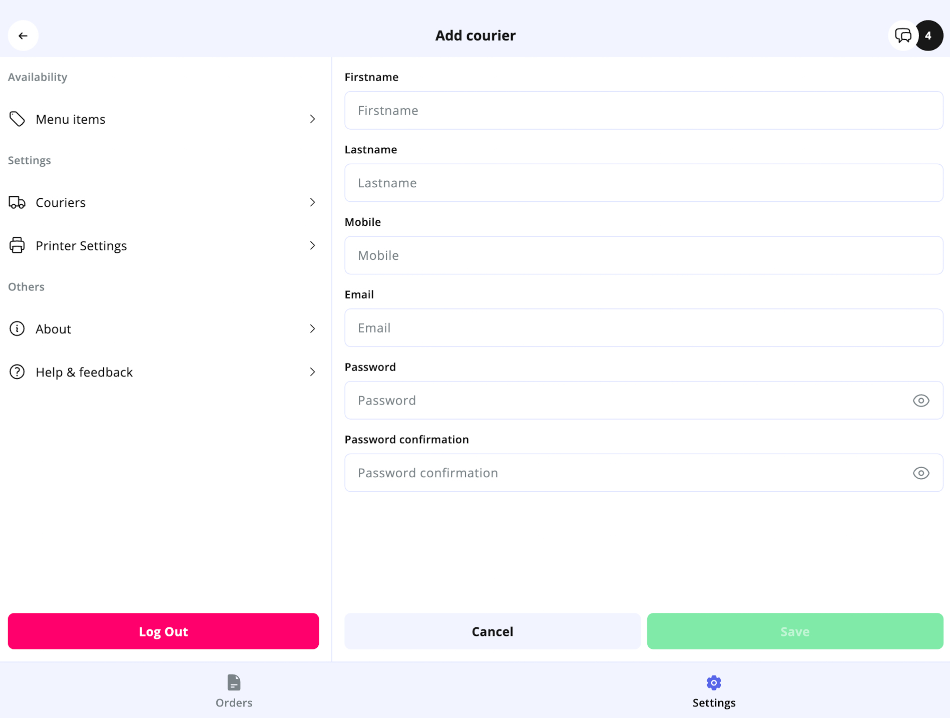 - Unavailable: The courier will not appear in the active courier list, preventing new orders from being assigned to them.