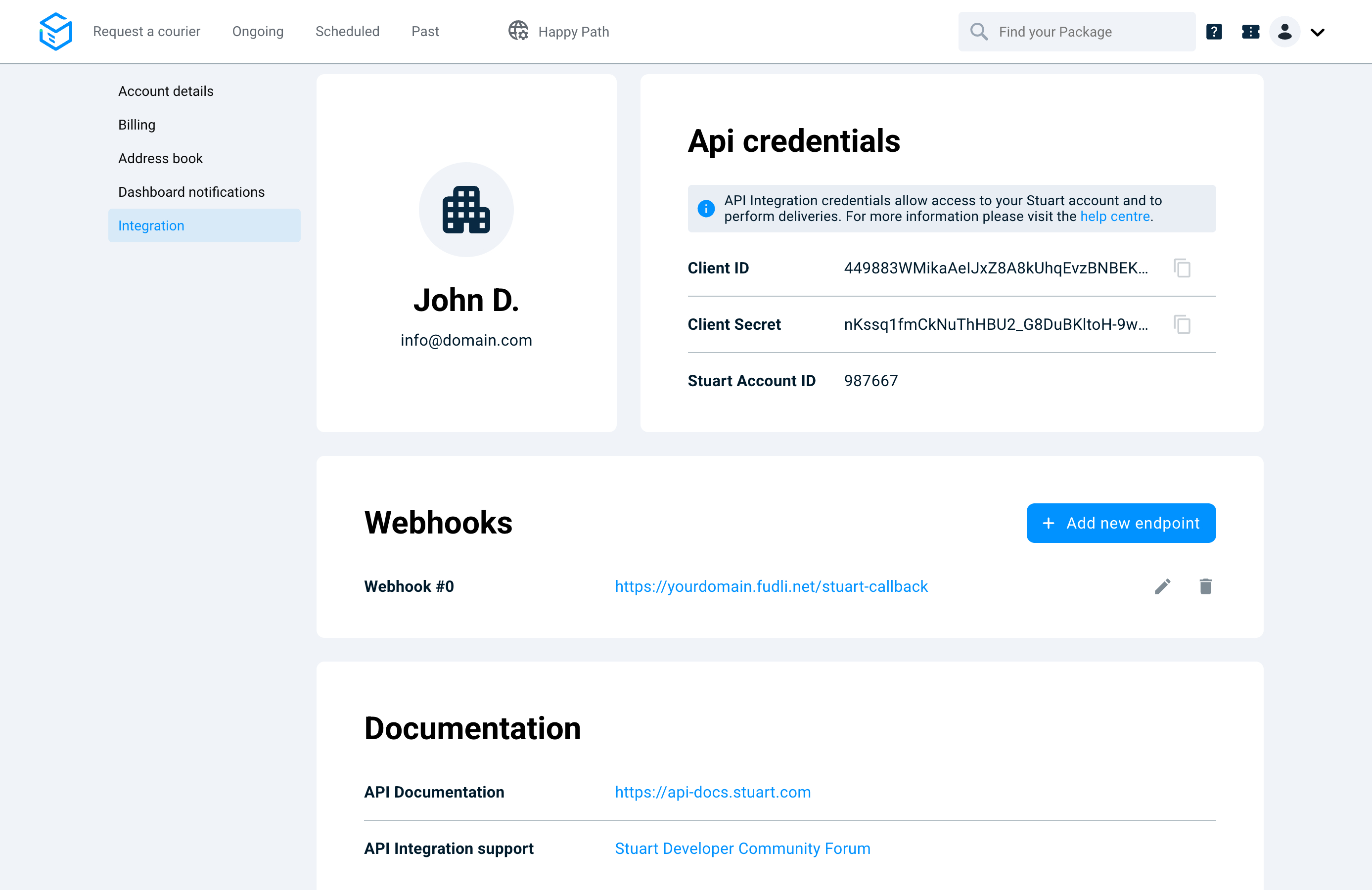 - Navigate to: Settings > Integration 👉 Stuart Integration Settings