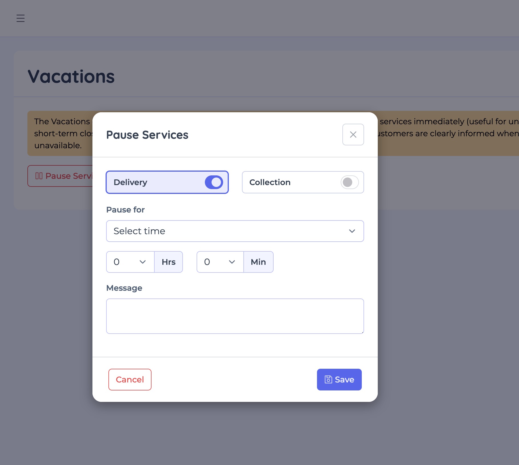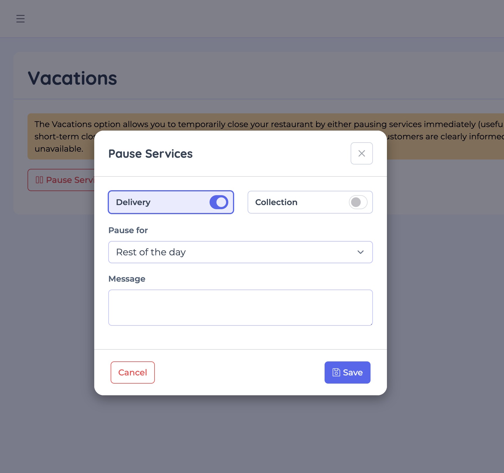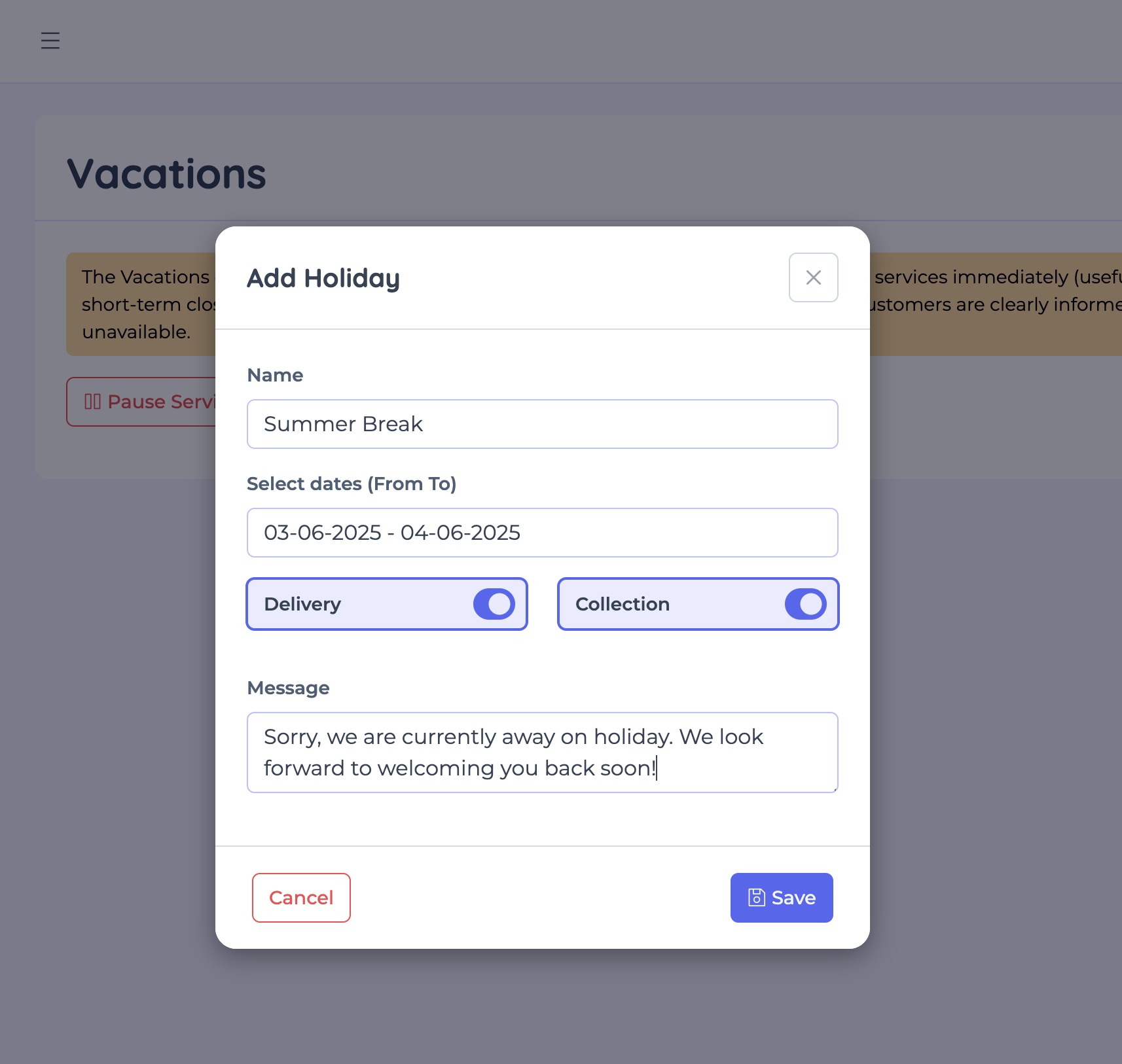 The Vacations feature ensures you remain in control of your availability. Whether it’s an unplanned pause or a scheduled holiday, you can easily manage your restaurant’s downtime while keeping your customers fully informed.