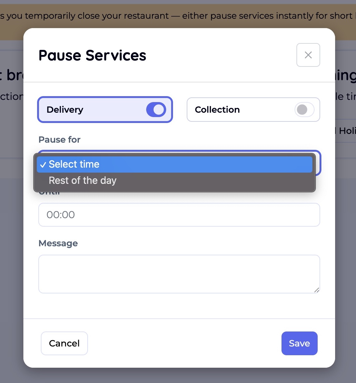 The Pause Services option is designed for sudden or same-day breaks. For example, if your kitchen needs to close unexpectedly or you are only closed for part of the day.