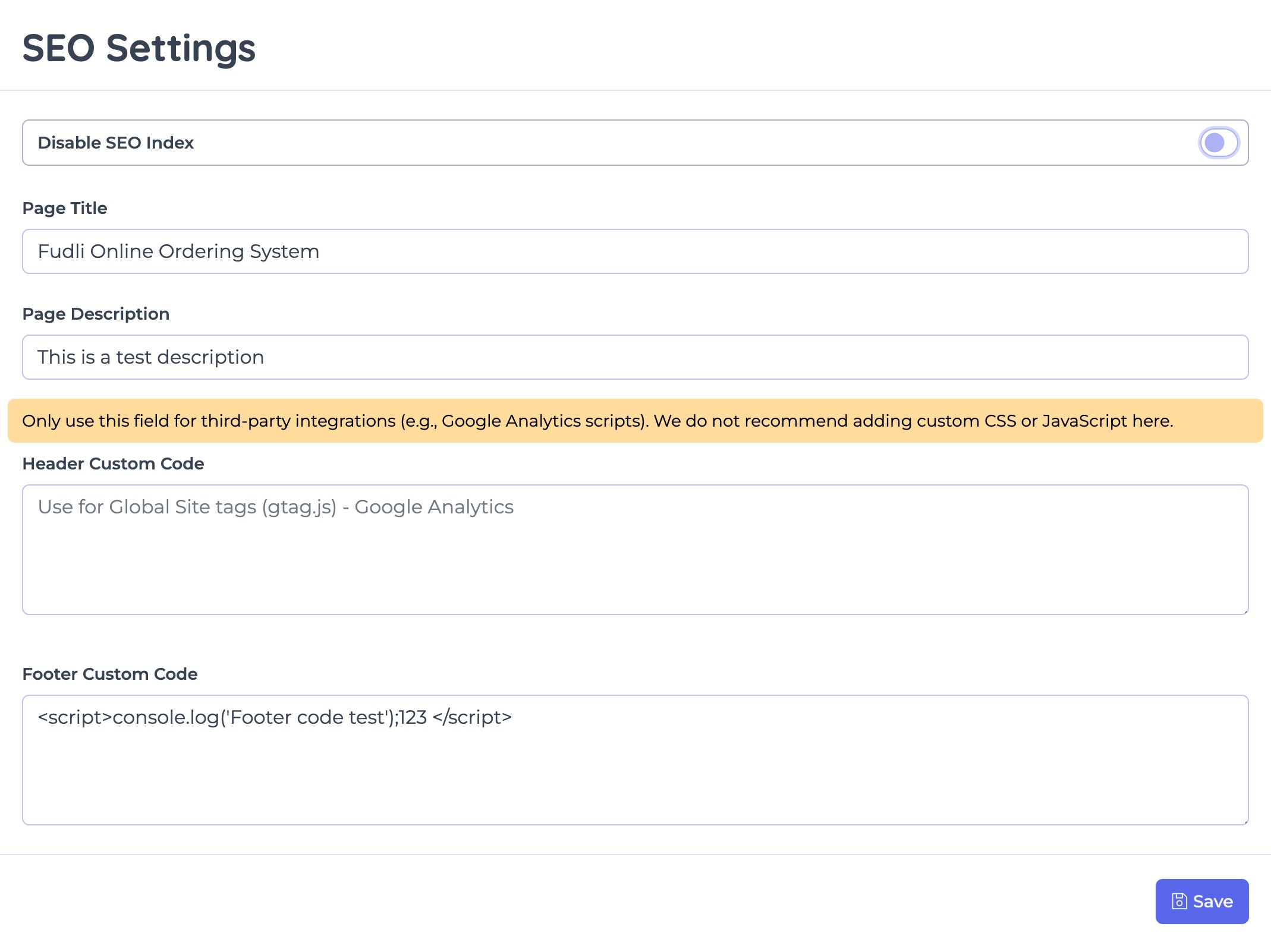 For advanced integrations, you can insert third-party scripts (such as Google Analytics or Facebook Pixel) directly into the header or footer of your ordering site.