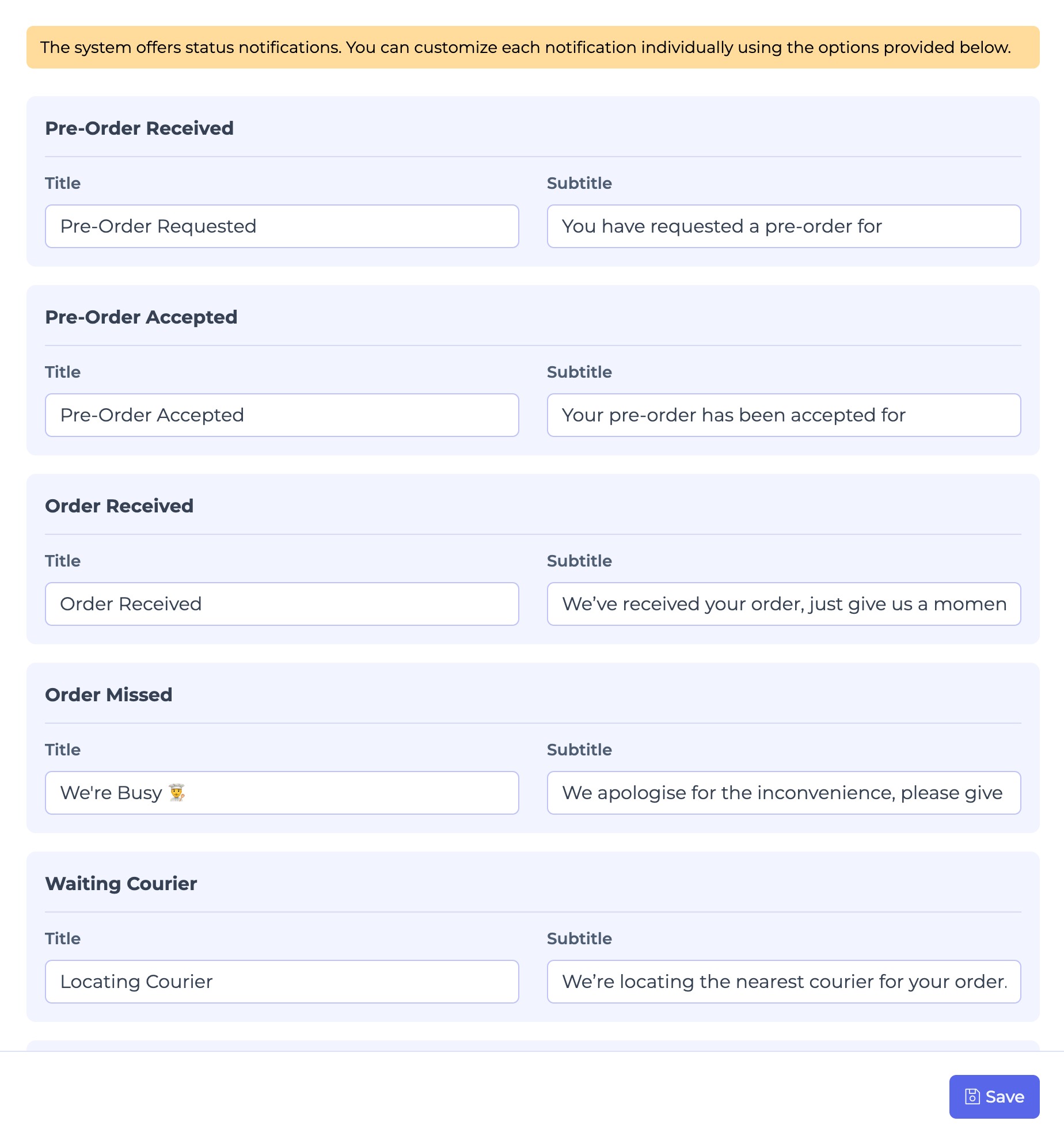 Order notifications keep both your team and your customers informed about the progress of an order in real time. Fudli’s system provides a range of status notifications that can be customised to match your brand’s tone of voice and operational needs.