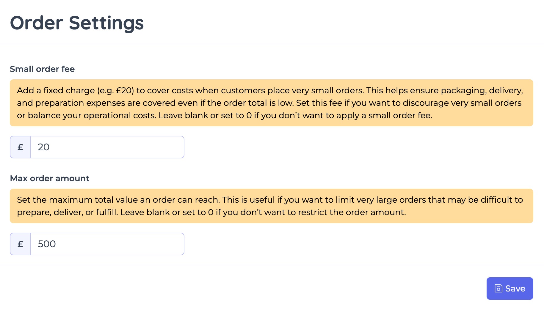 - Example: You could set a maximum order value of £250.00, preventing customers from placing bulk orders that may not be practical to prepare within a normal service window.