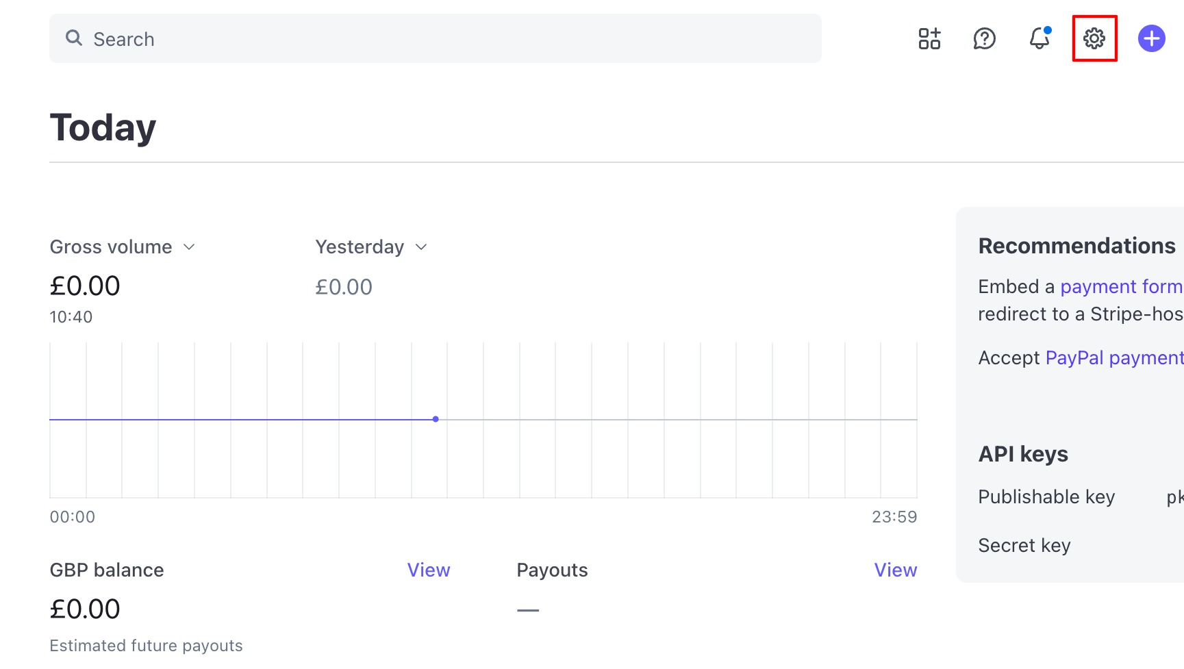 Log in to your Stripe Dashboard. Click on the Settings (cog icon) in the top-right corner.