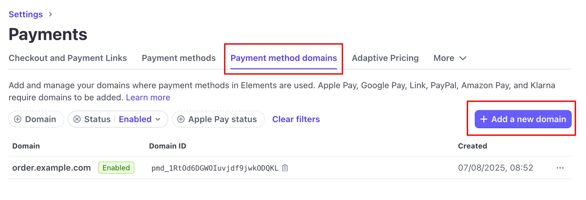 ✅ Tip: You must use the exact domain where your checkout is hosted. For example, if your checkout is on order.example.com, do not enter just example.com.