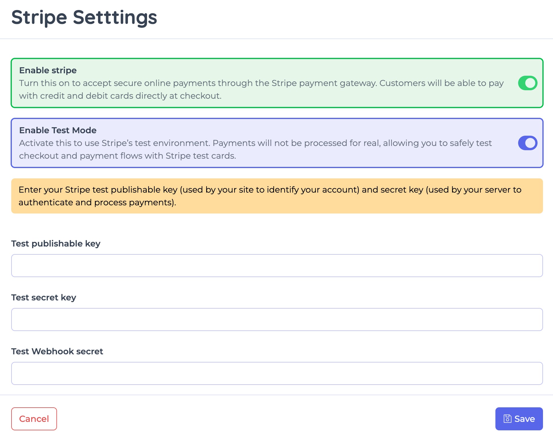 This guide walks you through connecting your Stripe account and configuring the required API keys and Webhook secrets.