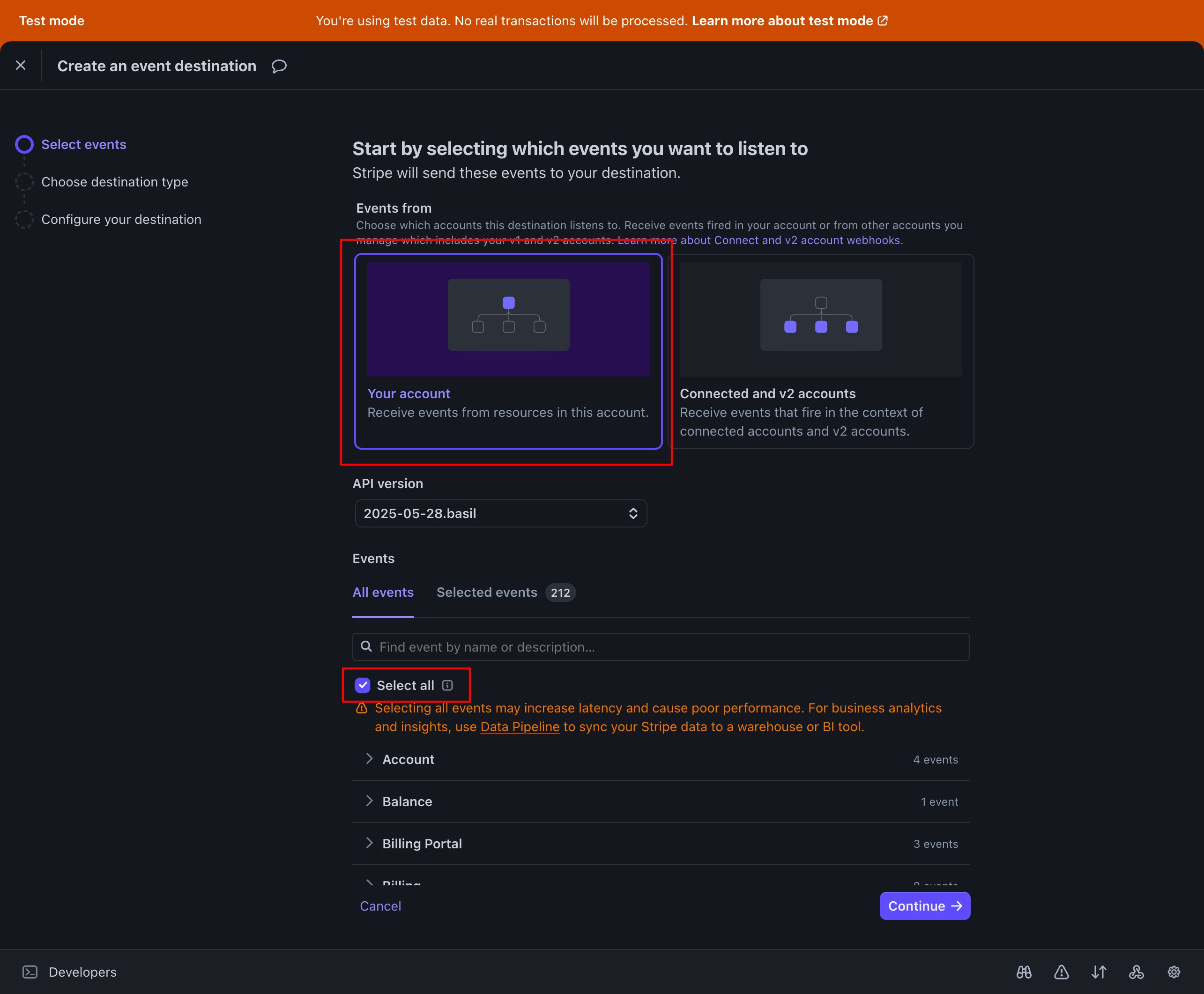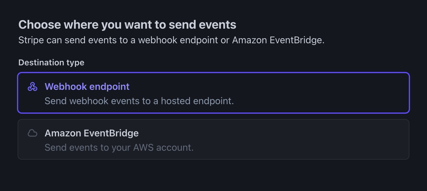 In Stripe Dashboard, go to Webhook creation page (Test Mode) and Webhook creation page (Live Mode)