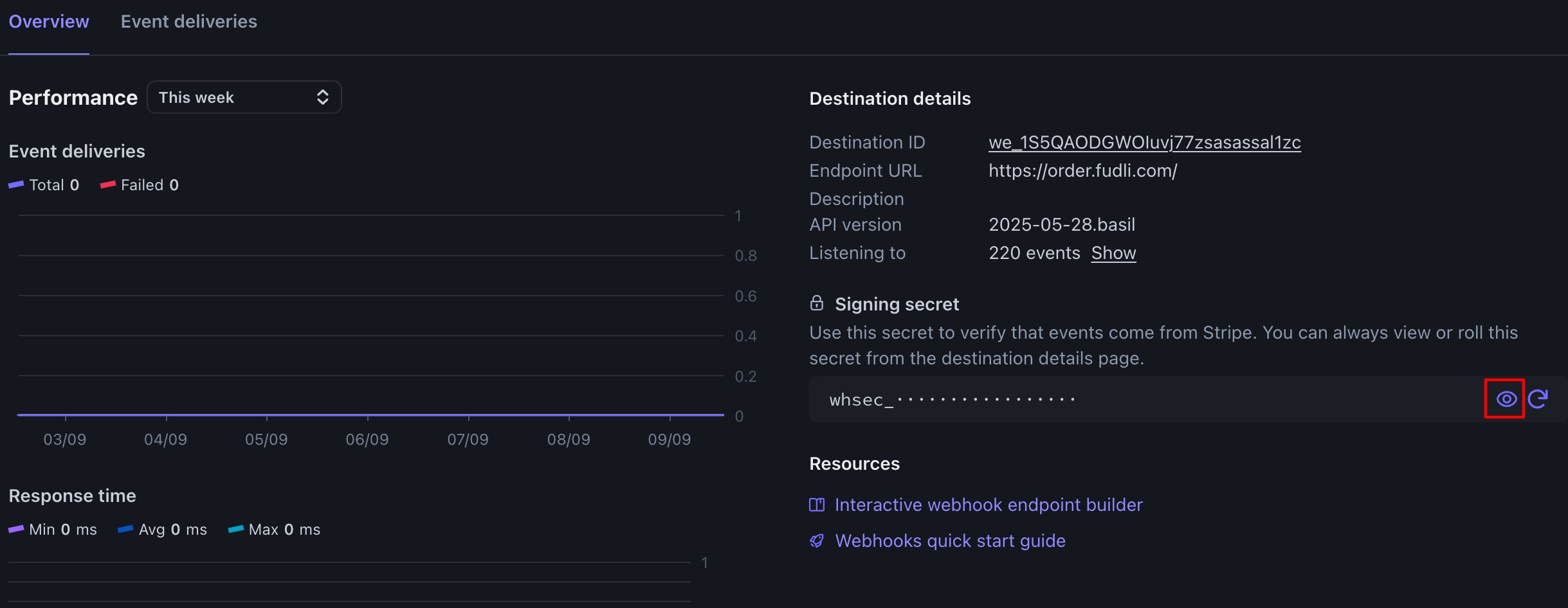 - Copy this and paste it into the Test Webhook Secret (for test mode) or Live Webhook Secret (for live mode) in Fudli.