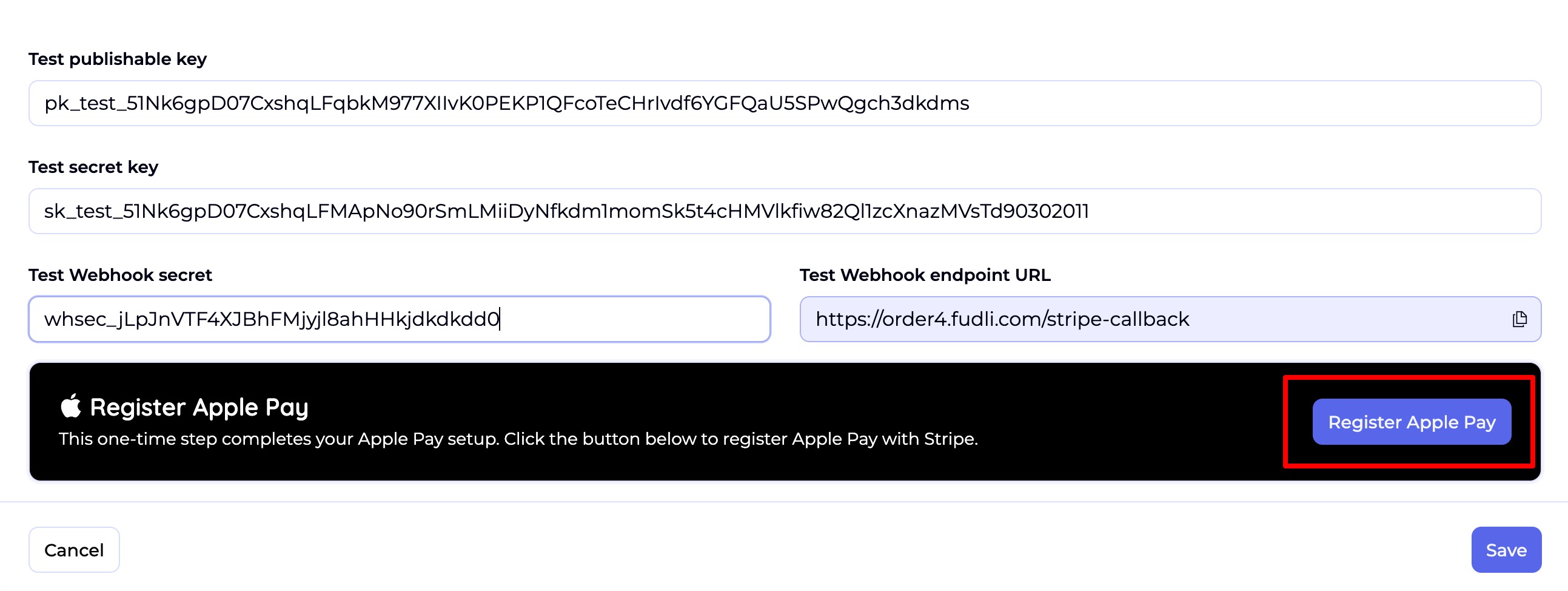 👉 Copy these values into the Test Mode or Live Mode fields inside Fudli.