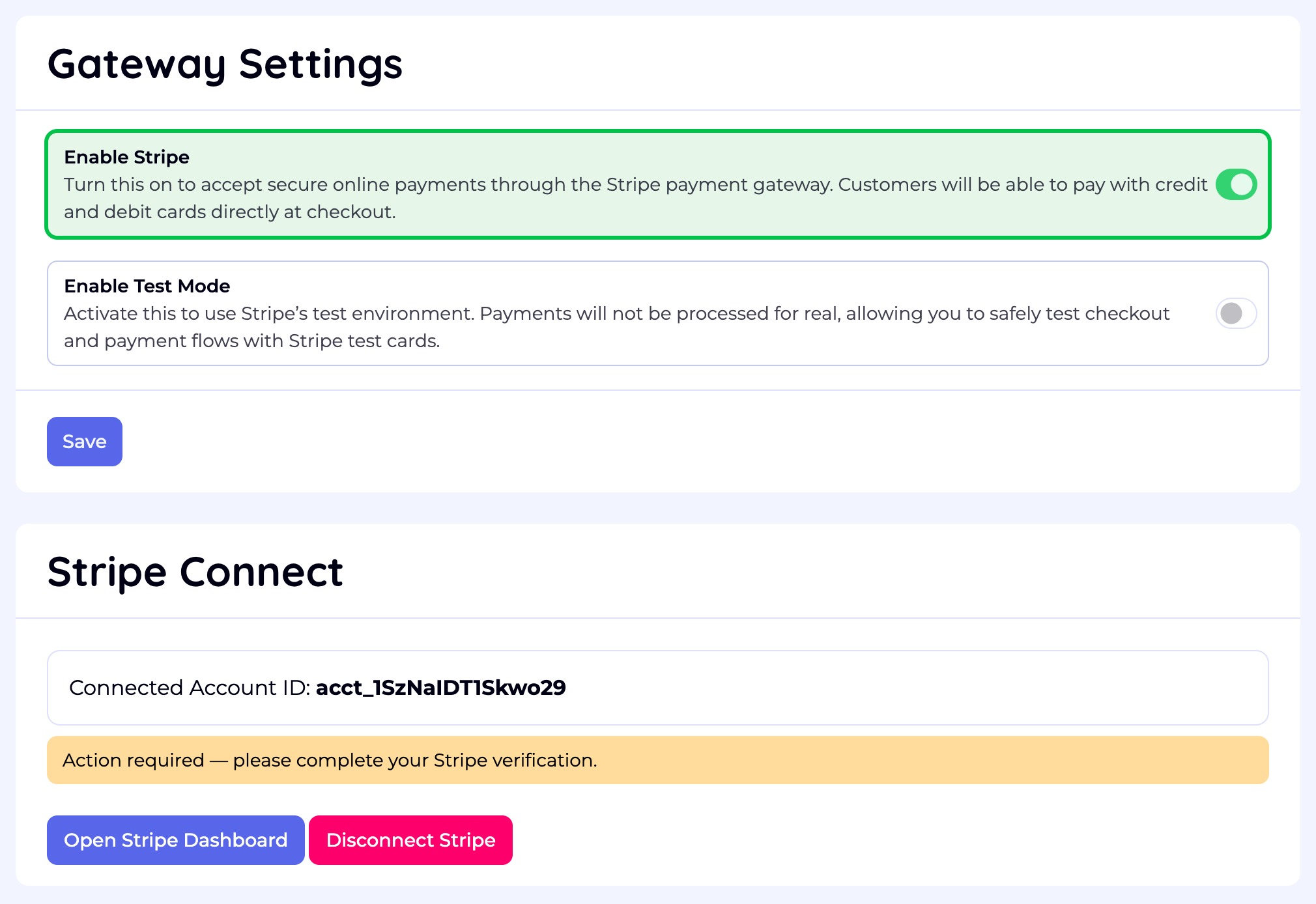 - Save your Stripe settings in Fudli.