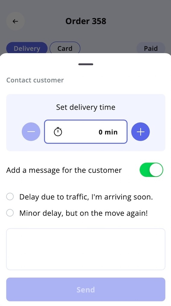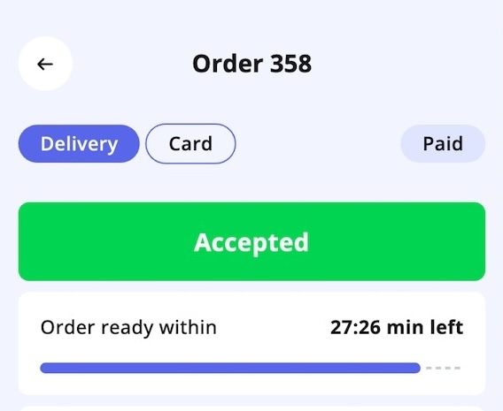 - The app shows a “Delivery in X minutes” countdown for each active order.