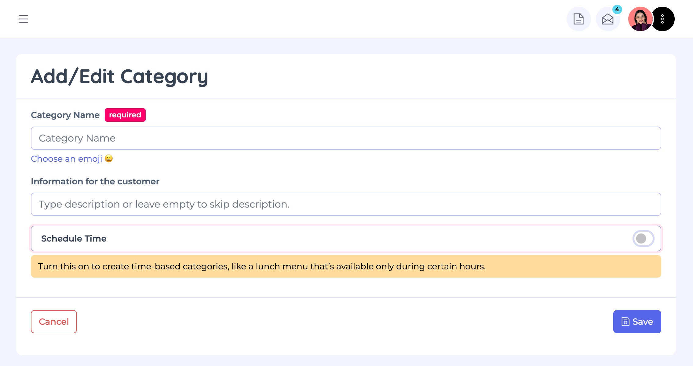 If you want certain categories to be available only at specific times (such as breakfast, lunch or happy hour), you can enable Scheduled Time Category.